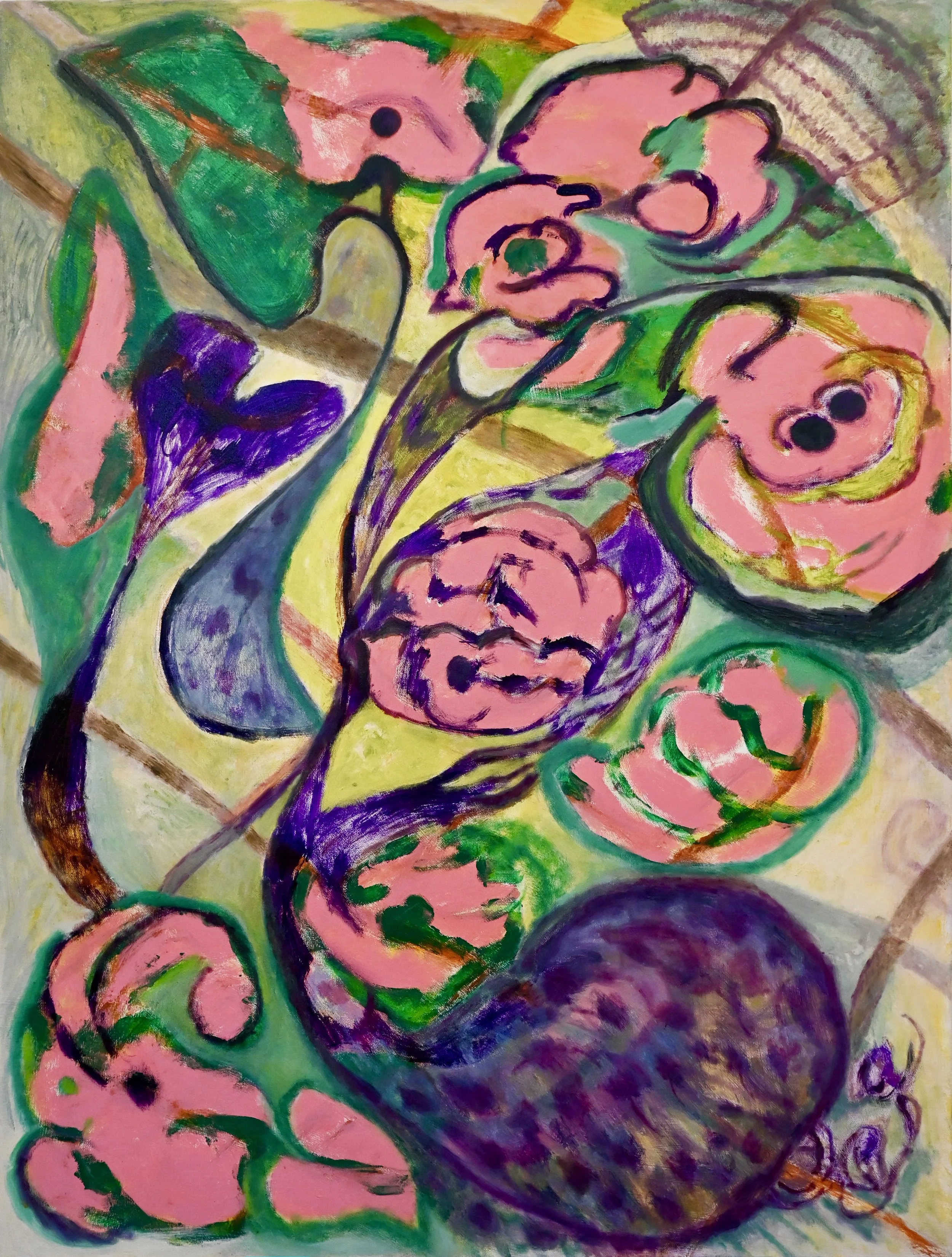 Red Bird Snake in Garden, 2025, oil on canvas, 18 x 24 in. (45 x 60 cm)